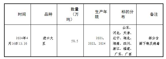 受中储粮油脂有限公司委托,2024年41613:30在国家粮食和物资储备局粮食交易协调中心及联网的各省(区、市)国家粮食交易中心组织开展进口大豆竞价交易,请交易会员通过国家粮食交易中心官网()“用户中心”,登录国家粮食交易平台,在专场列表中选择“进口大豆竞价销售交易”参与交易。现就有关事项公告如下(重点提示内容详见加粗字体部分)